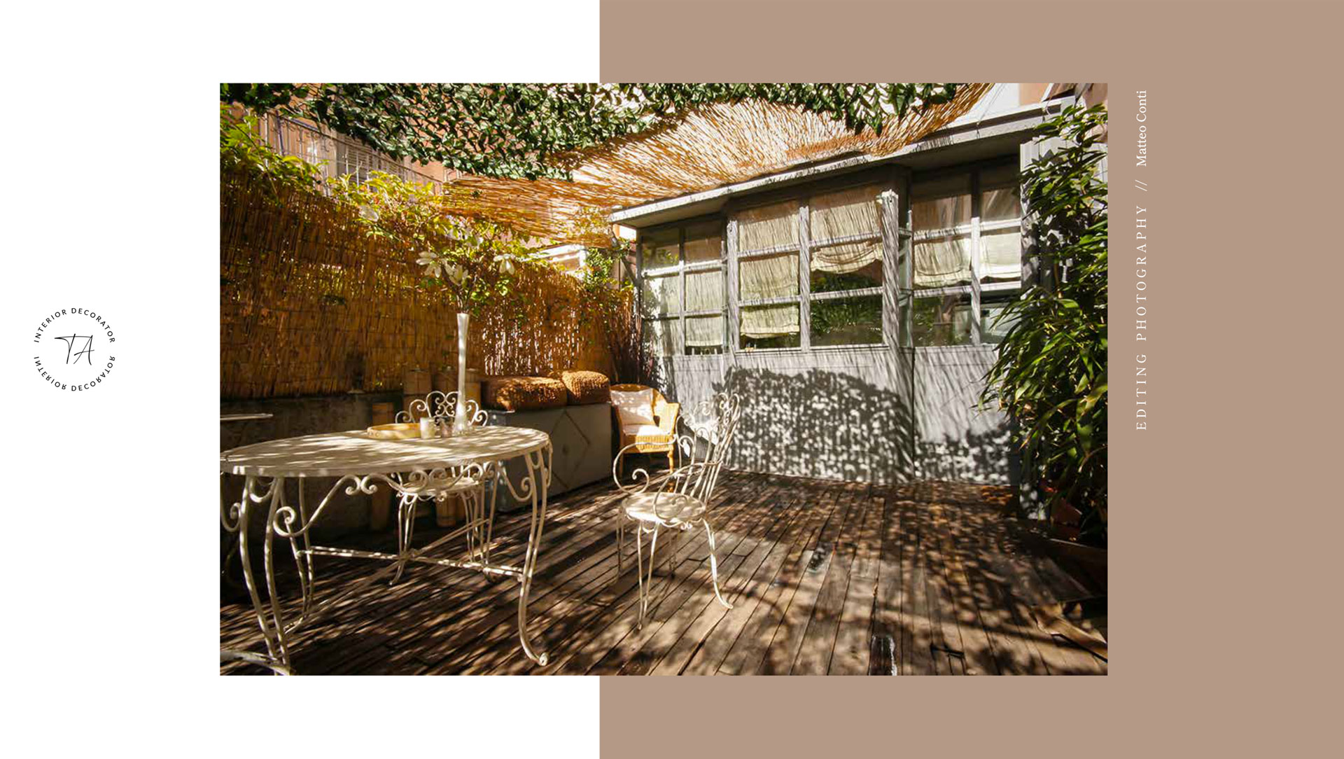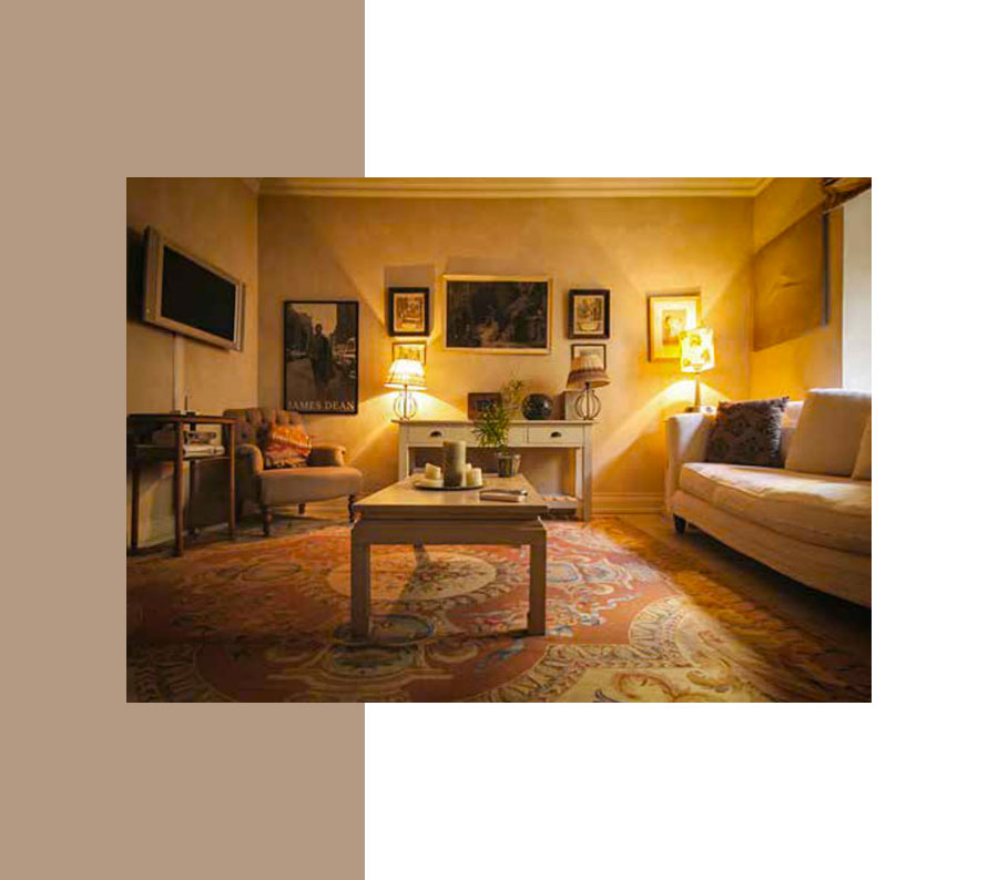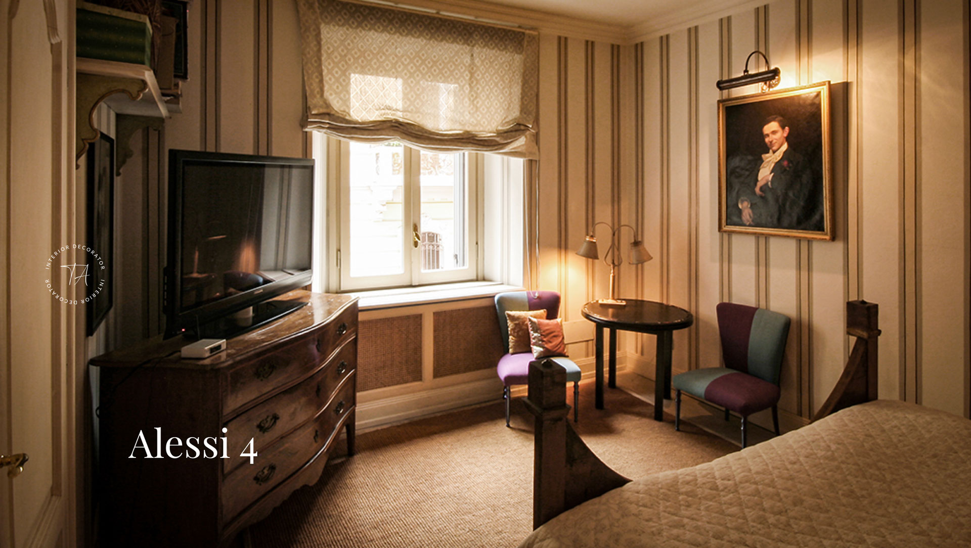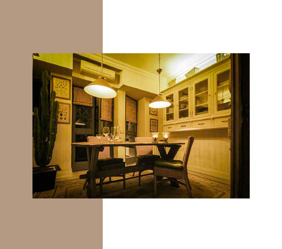 I muri della camera da letto e della sala pranzo sono stati pensati e dipinti come un tessuto rigato da camicia con tonalità e colori che scaldano l’ambiente, richiamando materiali naturali quali, il cocco, il bambù e il vimini.