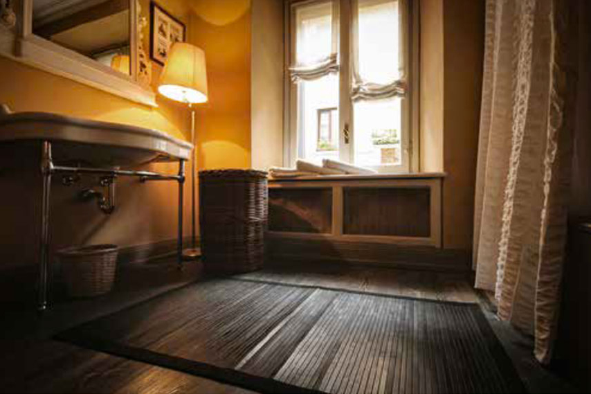 I pavimenti in listoni grezzi in parquet dipinto e insabbiato con colori chiari contribuiscono a dare maggior ampiezza e respiro alle stanze.