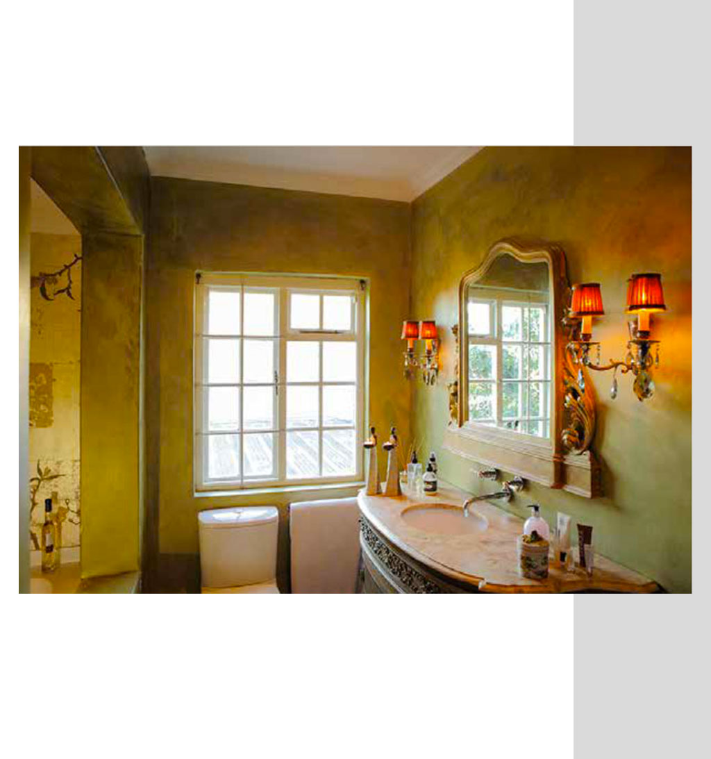 In uno dei bagni è stato ripreso lo stile arabaggiante tipico degli Hammam Marocchini, mentre in un altro si è puntato su una decorazione floreale dipinta a mano con diverse stesure di colore e tonalità di verde e oro.
